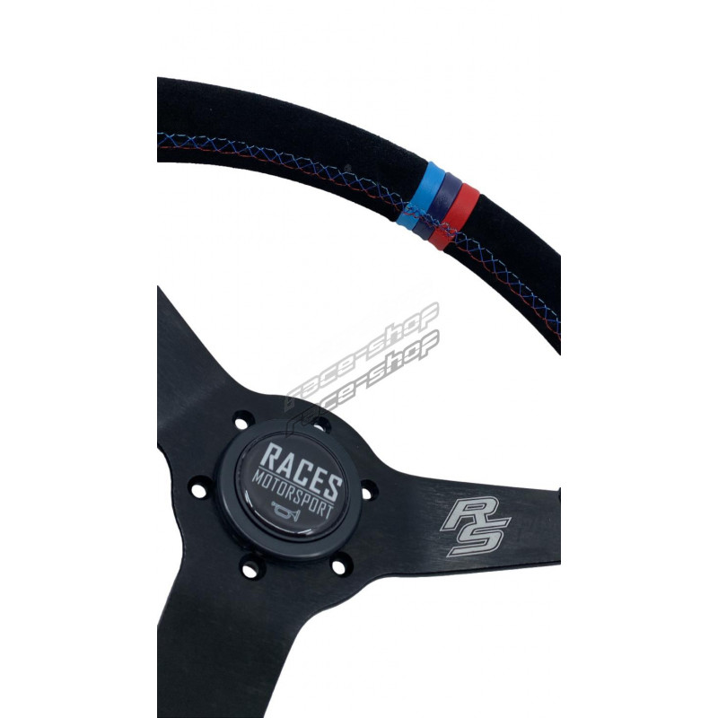 Volan sport velur cu 3 spițe și adâncime RACES MOTORSPORT. Potrivit pentru raliuri, drift și alte tipuri de motosport.Folosit