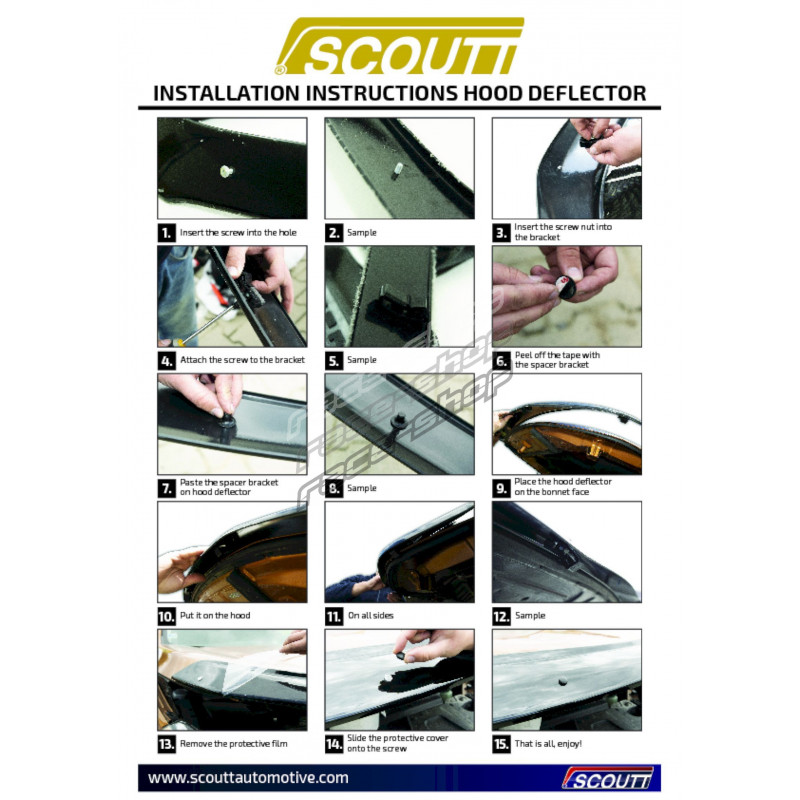 Deflectorul este fabricat din plexiglas turnat durabil. Acesta este fixat pe capotă cu ajutorul unor suporturi metalice speciale concepute pentru o instalare ușoară, fără a fi nevoie de găurire. De asemenea, deflectorul este separat de capotă prin silicon pentru a asigura o funcționare silențioasă, confortabilă și funcțională.