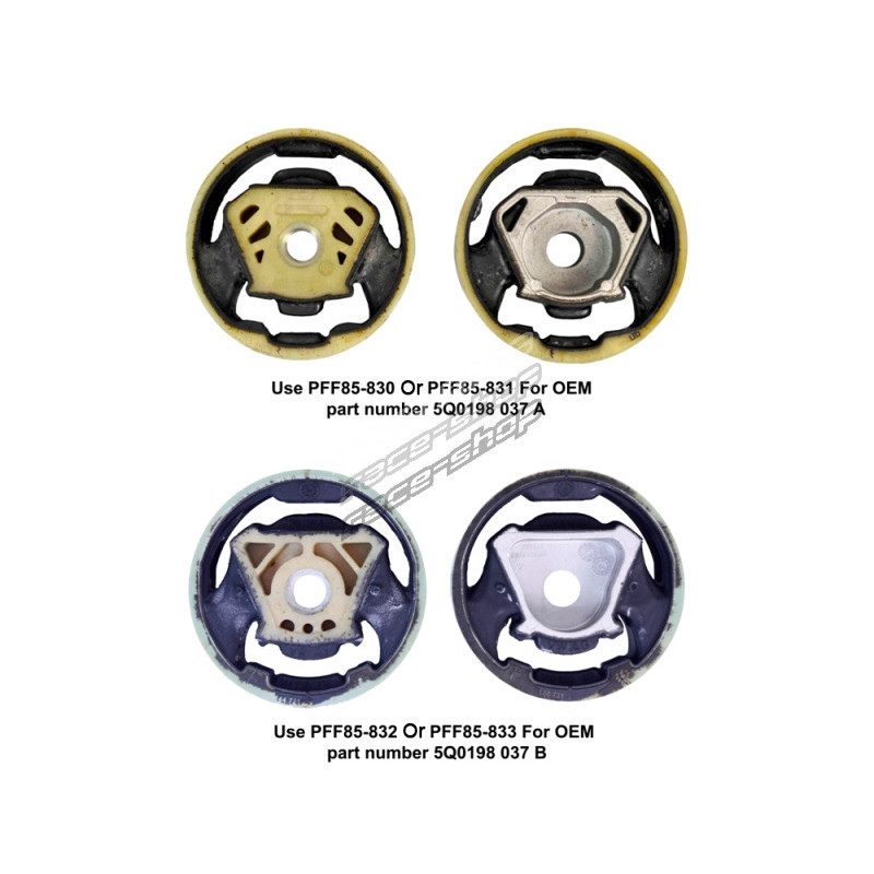 Notă: Această piesă este o inserție pentru numărul de piesă OEM 5Q0198 037 A. Adecvat pentru mașinile cu putere mai mare și mașini de pistă, folosind un material mai rigid care ajută la reducerea suplimentară a mișcării motorului față de echiparea standard. PFF85-830 inserție, fiind un material mai rigid, se pot resimți vibrații suplimentare de zgomot și.