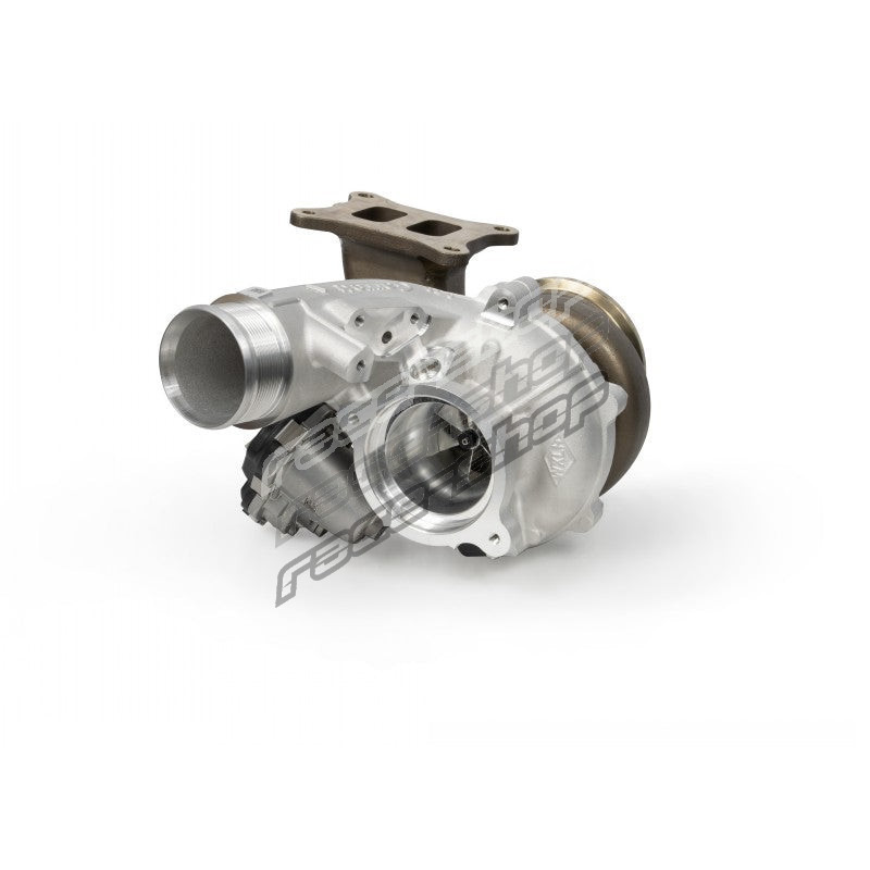 This upgraded version of the direct-mount turbocharger produced a staggering 520 hp. (383 kW) and 425 ft-lb (576 Nm) of torque when tuned conservatively on the dyno. During flow testing, this high performance turbocharger delivered +20% compressor flow and +37% turbine flow compared to the original turbocharger. The latest generation of Garrett compressor and turbine wheel technology ensures maximum flow and efficiency for this turbocharger, all from OEM production.